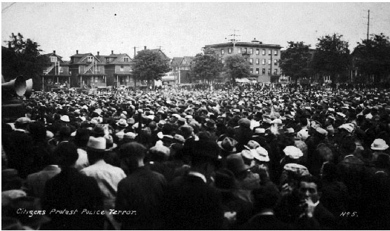 Later that night, police raided various strike headquarters and seized banners, posters, and newsletters. Crowds gathered at Carrall and Hastings Street once the word got out, and then smashed windows and clashed with the police. The next day, at a public meeting on the Cambie Street grounds, a call for a General Strike was made. It never materialized, but workers did participate in demonstrations and a one hour work-stoppage the next afternoon.