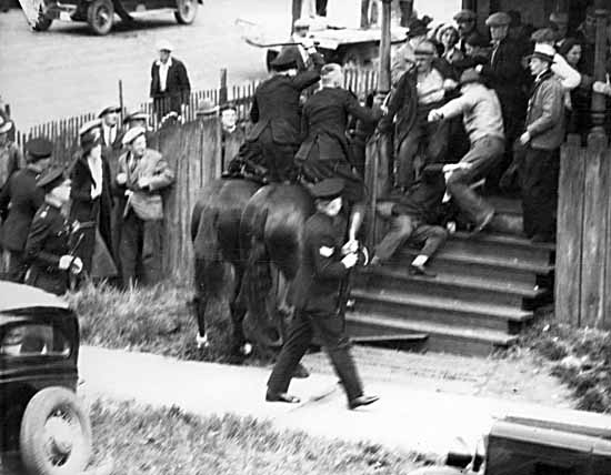 The first “Red Riot” of the Depression took place on August 1st of 1931, at the corner of Dunsmuir and Hamilton. The battle began when mounted police charged an “unpermitted” march led by a red flag. The marchers responded to the police attack by tearing up the pavement and ripping pickets from fences to use as weapons. The police claimed that citizens had also thrown rocks at them from houses.