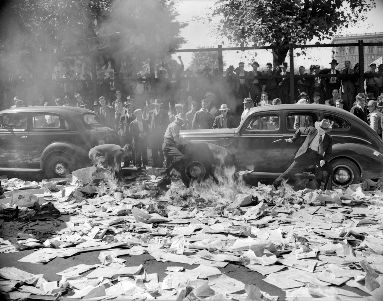 In 1945, the Southam-owned “Province” newspaper tried to drop national standards for printers. Typographical unions in Winnipeg, Hamilton, Ottawa, Edmonton, and Vancouver joined in a wildcat strike against Southam in June of 1945. The strike was lost in the east, but in Vancouver, The Province could not publish for six weeks, until scabs from across Canada got the paper out from behind picket lines. Southam applied for and received an injunction and launched a 250,000 dollar lawsuit against the union. In response the union called for a boycott of the paper. Striking printers burned copies of The Province in the street. In some towns across BC, the circulation of the paper dropped to zero. Province sales plummeted, and the company eventually conceded to the union in 1948. The 40 month strike cost The Province its position as number one paper in BC. Subscribers refused to return to such an anti-union paper after the strike was over, and the paper lost money for the next seven years.