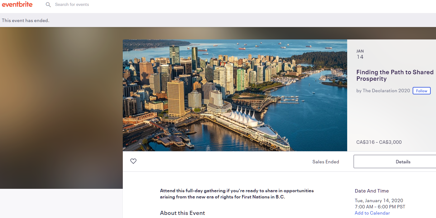 Entitled “UNDRIP 2020 – Finding the Path to Shared Prosperity,” the event’s tickets ran from $316 to $3,000, signaling that a conference about the business potential of Indigenous rights was also something of a business in itself.
