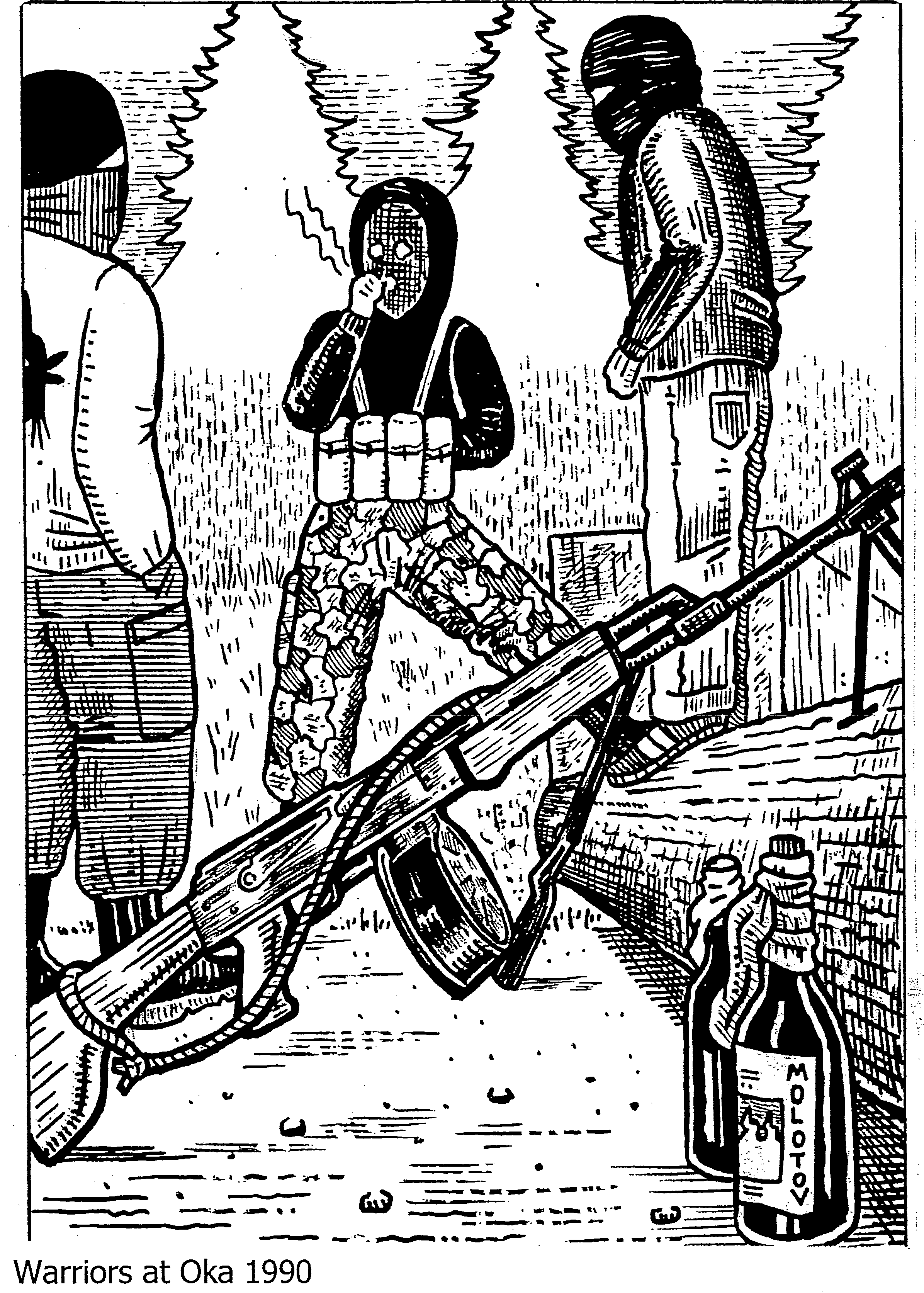 Oka Crisis. Over 100 heavily-armed Quebec police raid a Mohawk blockade at Kanesatake/Oka on June 11. In an initial fire-fight, one cop is shot & killed. A 77-day armed standoff begins, involving 2,000 police and 4,500 Canadian soldiers, deployed against both Kanesatake & Kahnawake. The Oka Crisis inspires solidarity actions across country, including road & rail blockades & sabotage of bridges & electrical pylons.