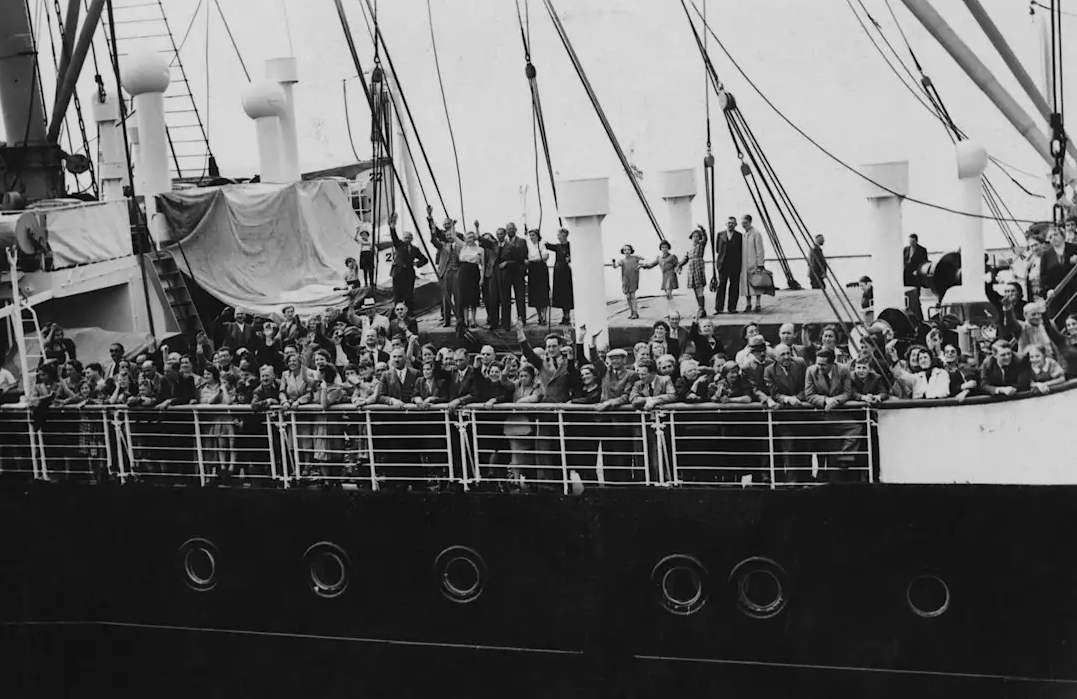 Refugees aboard the M.S. St. Louis, arriving in Antwerp, Belgium after over a month at sea, during which they were denied entry to Cuba